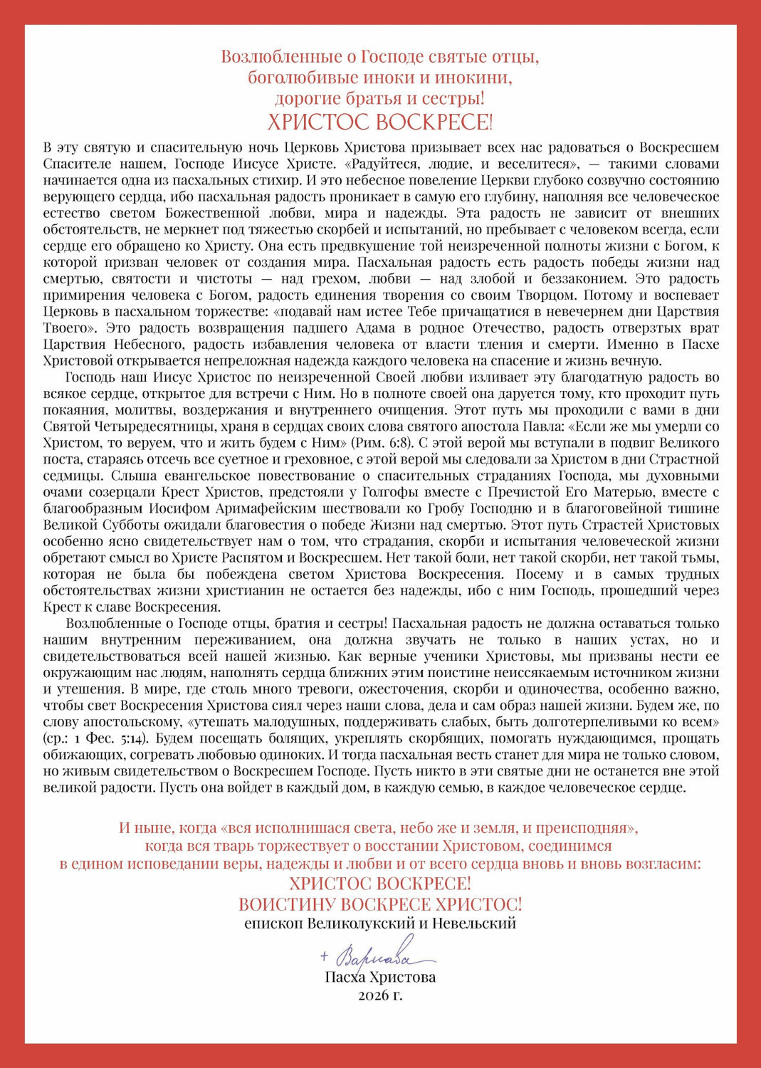 Пасхальное послание епископа Великолукского и Невельского ВАРНАВЫ
